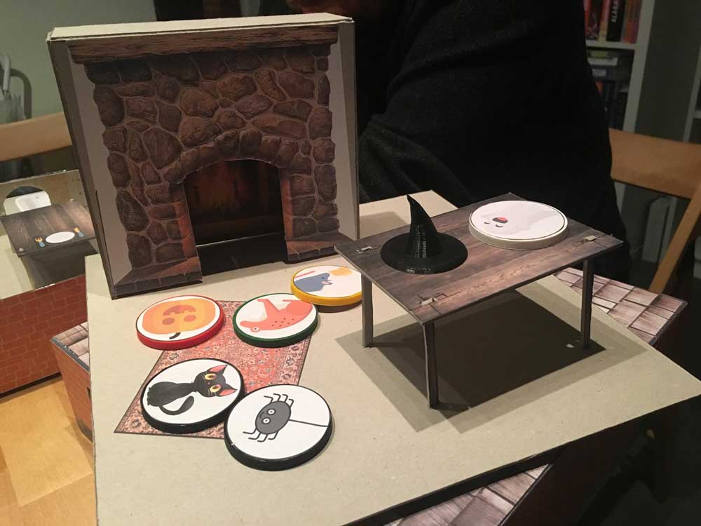 Élodie : Un soir comme un autre, je rentre du travail et découvre sur la table du salon un proto de jeu, comme beaucoup d’autres croisés dans notre appartement. Sauf que cette fois-ci la boîte, bricolée par Théo, renferme un début de décor de maison de sorcière. Aimant énormément les jeux de société, je suis assez avide de nouvelles découvertes en la matière (toutes mécaniques et thématiques confondues), mais ce qui me touche par-dessus tout dans un jeu c’est le fait de me sentir véritablement incluse dans une mécanique de jeu. J’aime y incarner mon propre rôle, devenir actrice d’un scénario ludique et me sentir basculer dans un univers tout entier. Et c’est cette fameuse sensation que je retrouve ce soir-là en testant le proto de Théo, penchée par-dessus un paravent, scrutant les affaires d’une sorcière avant son retour chez elle. Seul bémol à cette première expérience, Théo m’annonce que le proto ne fonctionne pas (et il y a effectivement quelques petits problèmes) et qu’il risque donc de se retrouver sur l’étagère des protos en passe d’être oubliés.