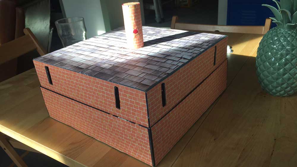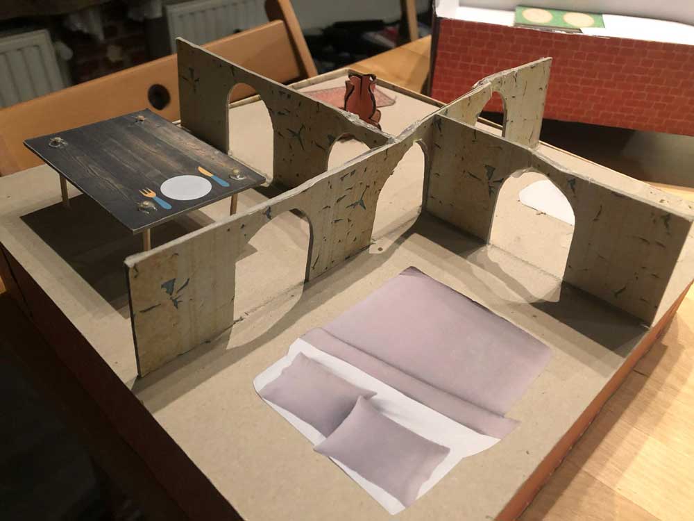 Élodie : Être co-autrice, c’est la première fois que l’on me fait cette proposition, donc je ne sais pas du tout où je mets les pieds. Tout ce que je sais (et ce qui me plaît déjà) c’est que je vais pouvoir mettre la main à la pâte pour la conception du deuxième proto de ce qui s’appelait alors « La maison de la sorcière ». Mesurer, découper et coller dans tous les sens, c’est d’ailleurs ce que l’on fait dès le lendemain, afin de voir au plus vite si l’idée évoquée la veille peut sauver le jeu. La boîte de jeu entière devient la maison de la sorcière, divisée en quatres pièces distinctes et nous utilisons le couvercle afin de servir de murs et de toit à cette nouvelle version. On reprend l’idée initiale de Théo d’avoir une lumière éclairant le tout durant un temps limité et boum… la maquette s’éclaire.